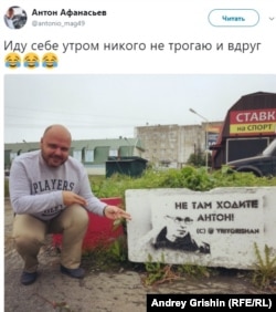 В Магадане на самых разбитых и неблагоустроенных улицах города повсюду внезапно появились спрайты (уличные рисунки, выполненные через трафарет), на которых нарисован мэр города и надпись: "Не там ходите, Антон". Автором этой фразы является глава Магадана Юрий Гришан. А сказал он ее в твиттере, поспорив там с магаданским блогером Антоном Афанасьевым о том, как в городе идут благоустроительные работы.