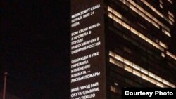 Послание экоактивистки из Новосибирска Саши Шугай спроецировали на здание штаб-квартиры ООН перед началом Саммита по мерам в области изменения климата. Свой рассказ она посвятила проблемам изменения климата и лесных пожаров в Сибири. Текст был представлен на русском и английском языках.