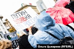 На маленьких и больших плакатах разноцветными красками было написано: "Антихрист – не в Америке. Он в Кремле", "Путинизм и фашизм – синонимы", "Путинизм и жизнь несовместимы", "Путин – удавка для России".