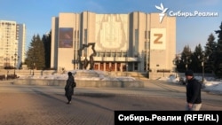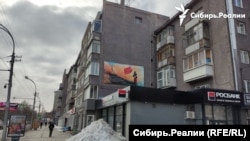 В центре Новосибирска на удивление мало Z-пропаганды. Начало главной улицы – Красного проспекта – вообще выгладит довоенным, в том числе перед зданием правительства и мэрией. Лишь на остановке "Дом офицеров", практически напротив городского ЗАГСа, на боковой стене притаилась бабушка с красным флагом, хотя, кажется все уже знают, что не в поддержку России она взяла этот флаг.