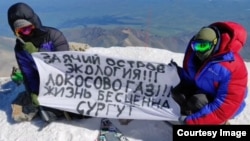 "Зайчий остров Экология!!! Локосово – газ!!! Жизнь бесценна Сургут" – транспарант с такой надписью держат на продуваемой всеми ветрами заснеженной вершине Эльбруса отец и сын. На их лицах горнолыжные маски и очки с высокой степенью защиты. Сильный ветер мешает говорить и практически вырывает транспарант из рук.